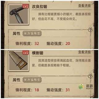 2、第一把锯子是普通锯,第二把(黄锯)加观赏减疗效,第三把(细锯)加疗效减观赏,最后一把(弯锯)样样精通,前期建议升第二把黄锯,3级左右就行,毕竟是过渡道具,道具选手套(有钱就升级,手套必须拉满不然你中期教会考核过不去直接游戏结束),剩下两个随你便。有了最后一把锯就无脑升级就行,锯子随剧情解锁很快,不像刀那么拖。