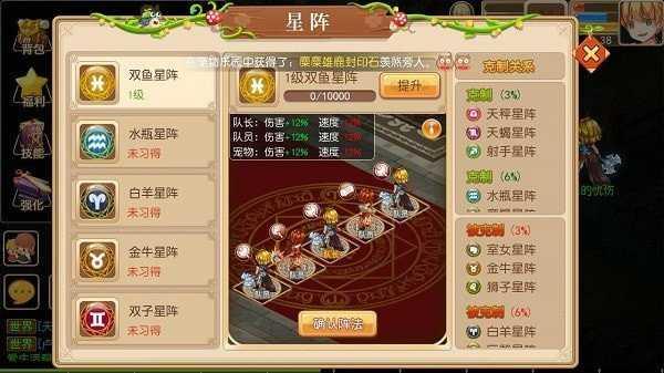 解析:双鱼恩惠是十二星阵中大幅度增加伤害的星阵,对于普通任务有很好的效果,建议在任务使用,PK时要看己方职业搭配进行选择。