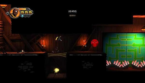 3、珠子在关卡各处都有,一般小型珠子都在行进的道路旁,大型珠子和黑字则需要一些跳跃技巧进入相对隐蔽的区域获得,关卡中还有各类障碍需要破除,图中的隔板就需要冲刺攻击打碎才能前进。通关所用时间也是游戏的重要评定因素。因此除了操作熟练,还需要简化操作,图中下方的敌人就可以利用跳跃冲击攻击,同时吃到沿途的珠子。
