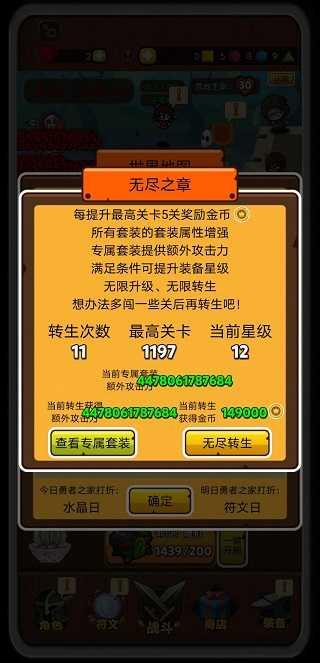 游戏属于收集套装过关放置类,有套装系统,符文系统,强化属性系统,红宝石是最重要的游戏资源,可以合成套装跟加强勇者之证,有四个英雄: