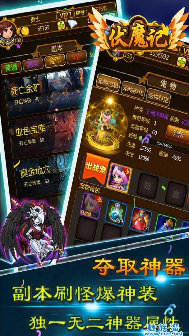 1)魔主要产出神石,击败怪物可以获得神圣,每个玩家根据VIP等级的不同挑战影魔的次数也不同,vip等级越高次数越多,获得的材料也相对比较多;影魔的怪物属性跟自身角色属性有关,不建议角色属性太偏一,太偏一容易打不过;在打怪的过程中,如果失败可以看视频或者用钻石复活,复活次数每天有限制哒;尽量保证自己能通关,因为越后面材料越高级越丰富;
