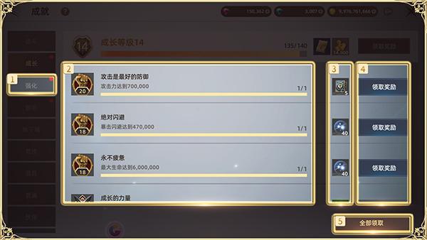 2、达成成就目标之后,领取奖励按钮将会激活,点击后即可领取成就奖励,也可以点击右下角全部领取按钮,一键领取奖励。
