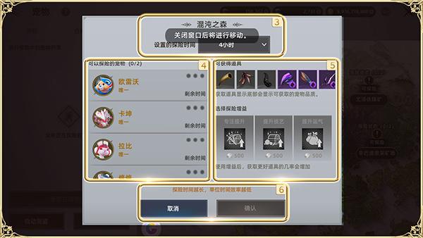 3、左侧可以查看探索的宠物列表,右侧显示可以获得的道具及可购买的增益效果(专注、技巧、运气提升,提高高品质道具出现概率)。