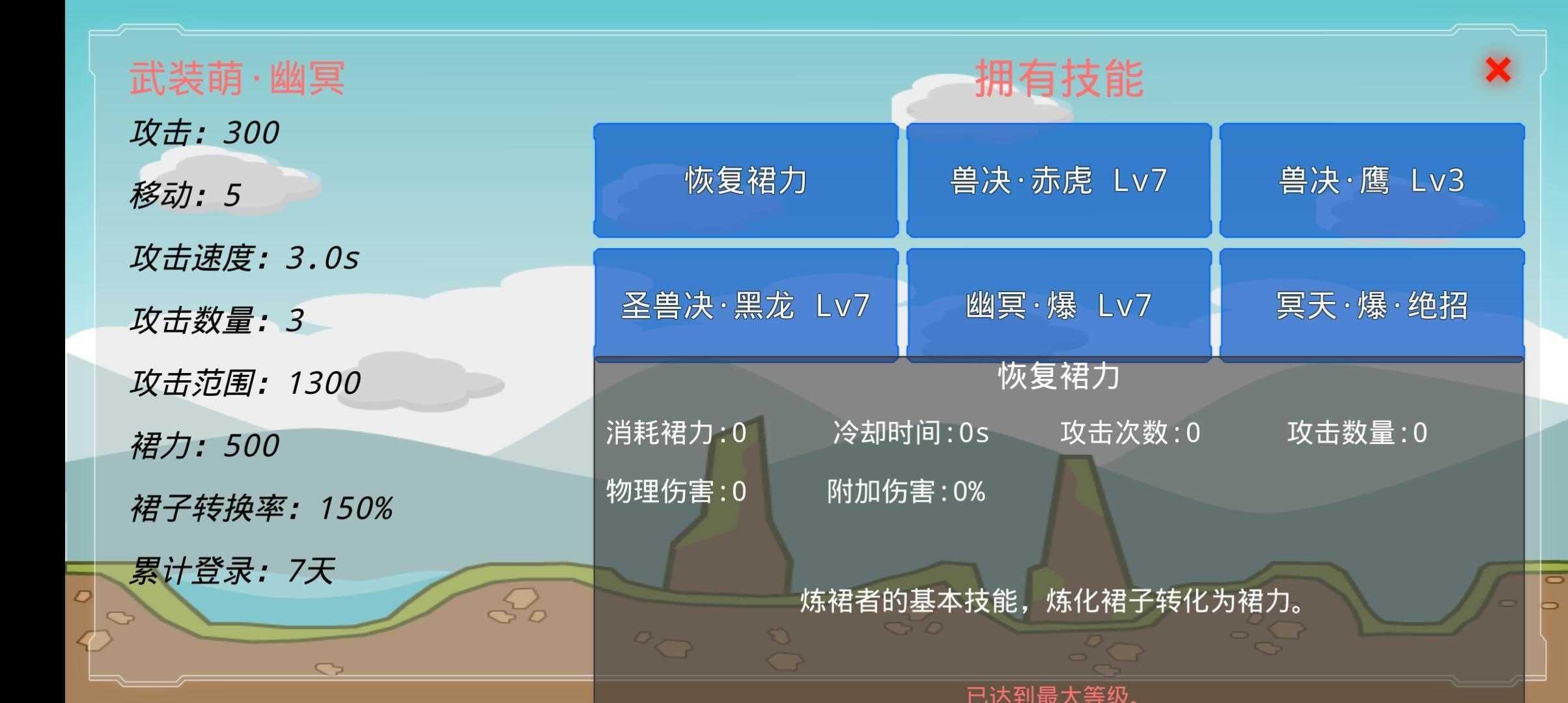 前提:化神,技能和武装少女都升满了(纤纤我因为手机屏看不到是1级,也不知道能不能升级,不过问题不大),然后觉醒选蓝毛(地球保护者)