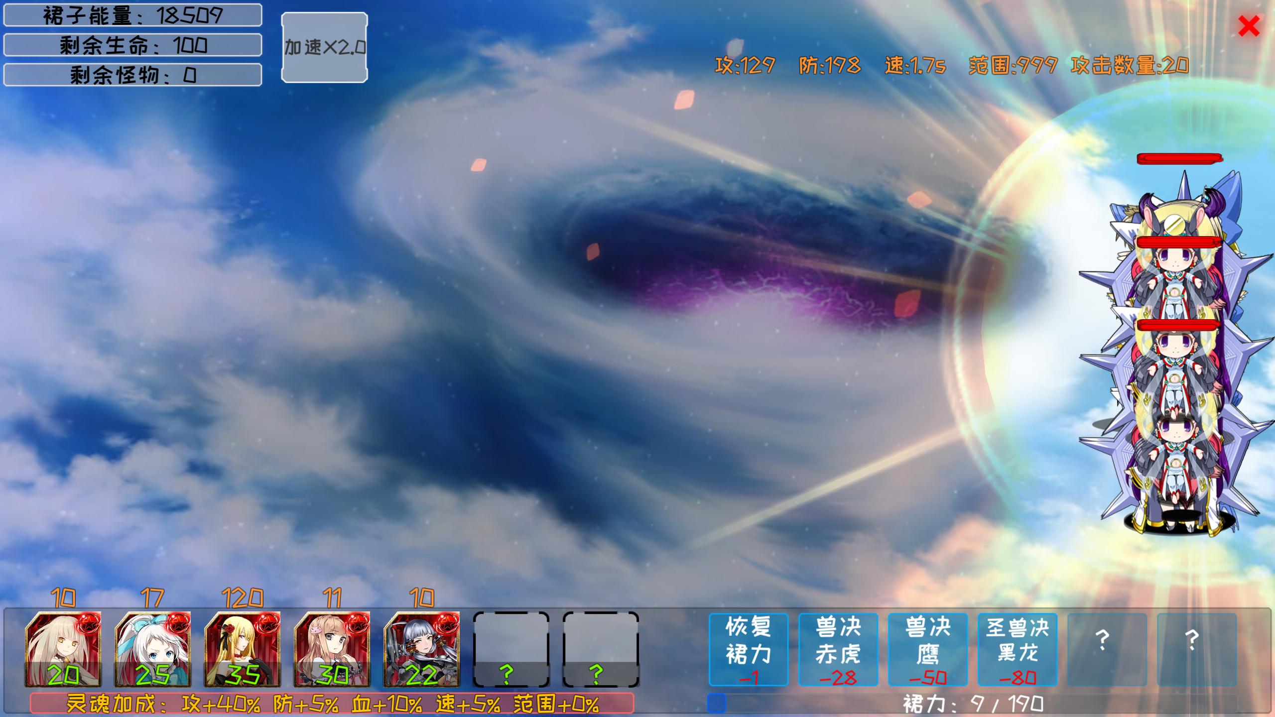 攻略:开局上6个小龙王(因为攻击数量是6嘛),然后上2个裙姬减攻速(因为裙楼自身攻速是1s,其实1个也行,我是保险上两个),紫魅3个减攻击(因为紫魅攻速2.4s,按无缝1s上3个),然后就上纤纤奶妈(保险25个,反正裙子够用)。当然这些都只是为了苟住,真正的伤害还得靠幽冥爆,大概爆两次boss应该1/3血了,这时候就用黑龙和鹰,黑龙两三个就行了,虽然是固伤但攻速太慢,后面boss暴走也是脆皮,实测鹰打的伤害比龙高,而且只消耗50。