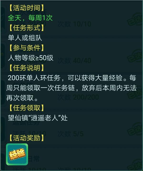 少侠达到50级后将开启任务链,这个任务链有200环,一环比一环经验多,这可是回合制老玩家都知道,并且不会放过的必做任务之一,而且很多少侠的等级都是靠跑环来拉开距离的