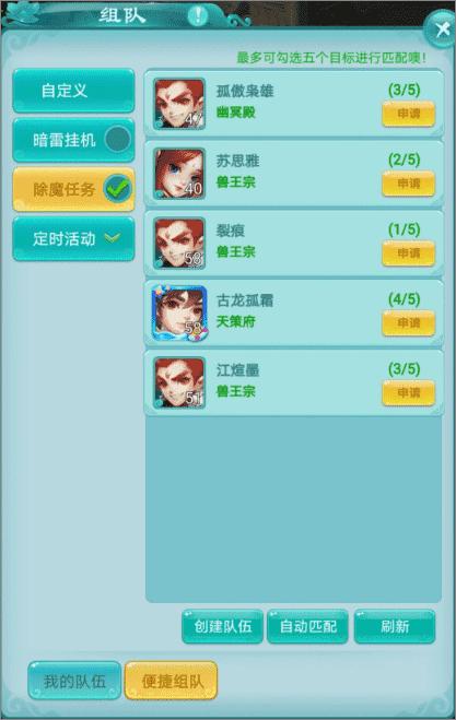 而且组队也超简单的,不管是自己当队长还是想混队伍,世界喊一喊或者点击组队界面快速匹配队伍,人就来了呢,你说封妖除魔次数太多完成太慢?