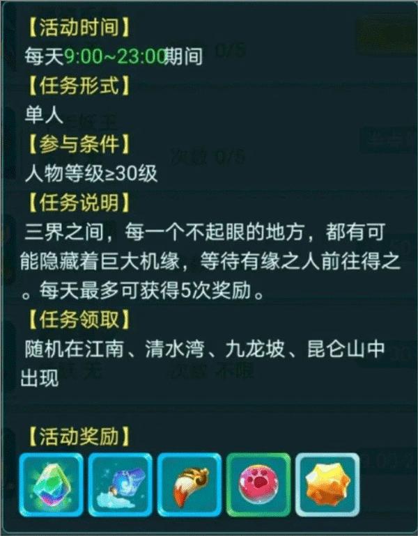 在三界每一个不起眼的地方,都可能藏着巨大的机缘,少侠遇见这些机缘千万不要放过,接取仙缘并完成,你也能获得大量的经验,每天可接取5次仙缘