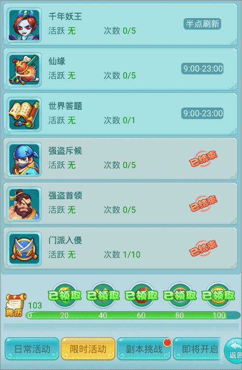 还有一些限时任务,比如“强盗首领”、“强盗斥候”、“门派入侵”“幻境寻宝”等,早间或晚间活动也要参加哦
