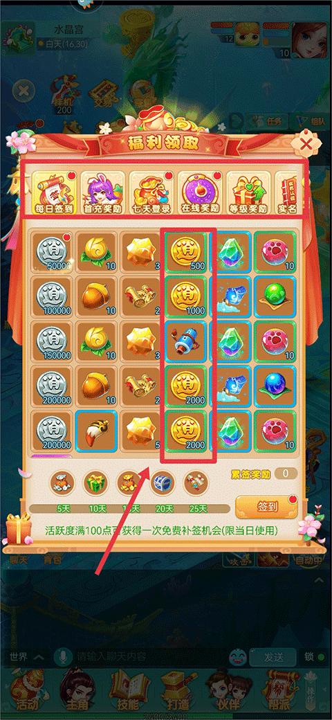 1、福利领取:每日签到、在线奖励、等级奖励等福利中可以领取到金币