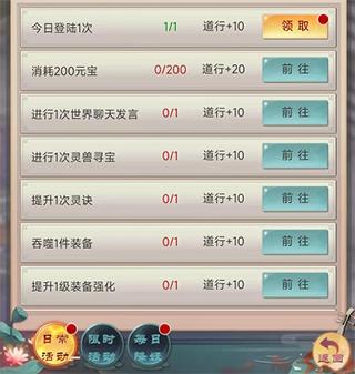 日常任务的完成奖励也是元宝获取方式的一种,日常任务可以于日常菜单中查看,完成每一个任务都可以获得道行,累积达到一定量级的道行后即可获得元宝。