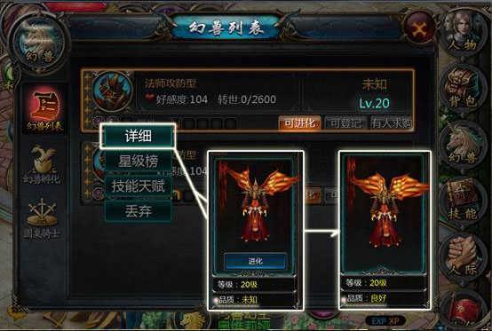 幻兽到达20级时,就可以进行第一次进化了,你的幻兽界面中会出现一个进化确认框。