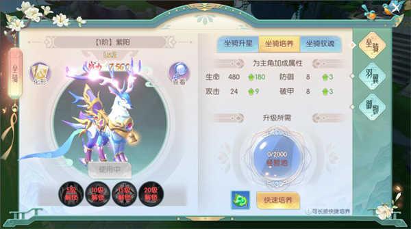 快速培养坐骑,可提升生命力、防御力、攻击力和破甲能力。