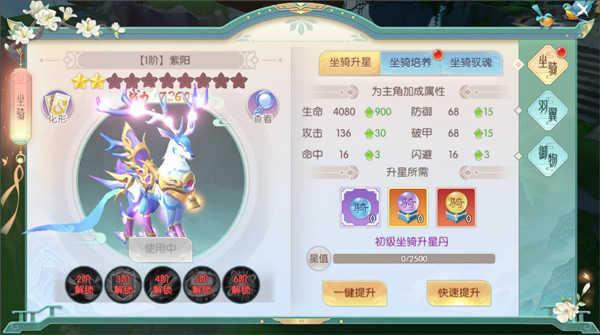 坐骑每升一阶提升1%升星属性,使用坐骑驭魂丹可增加属性,使用一定数量后可提升品阶。