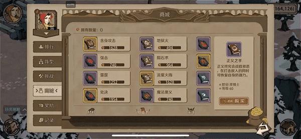大家可以看到,上面的是擂台赛可以兑换的一些高级材料、高级技能书以及特有的人物英雄,这些都需要勇者金币进行兑换,金币的获得主要是依靠PVP的段位,需要玩家去勇敢挑战别人。