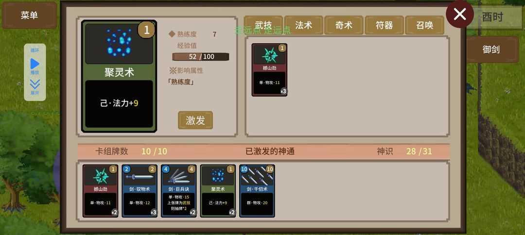 技能配置(熟练度低时聚灵术加2张,巨兵术减1张,千仞术减1张)