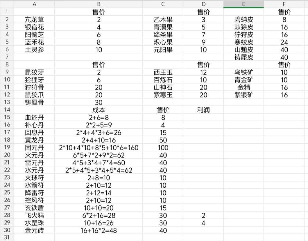 由图可知:制符熟练度可以靠火球符刷,炼丹熟练度可以靠血还丹(建议留一百多个),能赚钱的只有飞火鸦和水纹珠。自己造比买划算