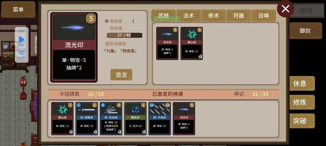升到练气十一层后去城东的“玄法”店买“流光印”(版本答案!),调整技能配置,