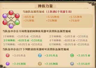 3、上阵角色有6个同族角色时,所有属性增加30%