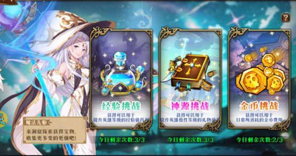 洞窟挑战为全天开发,对应每个副本次数为3挑战机会,刷新时间为每天0点刷新,玩法副本共分为神源挑战,经验挑战,金币挑战。通过过后分别获得培养英雄的材料。