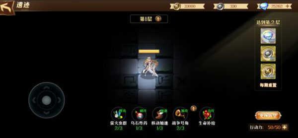 点击“前往探险”后进入遗迹探险界面。通过左下角滑轮,进行左右上下移动,角色有自身的一个视野范围,通过滑轮移动后,显示看到的新的视野范围板块。未走过的板块将以黑色遮罩挡住地图。首次开启以及每日0点时会获得25点行动力值。每碰触1个事件将扣除1点行动力。移动不扣,角色头上有对应血条,在地图内探险时,战斗后扣除的血量只能通过特殊功能“生命补给”来补充,无法自动恢复。