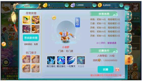角色达到20级之后,开启同伴系统,可以在酒馆中招募同伴;同伴分为“寻常侠客”和“名门子弟”两种类型,寻常侠客分为普普通通、能力不错、出类拔萃、绝世奇才四个品质,建议选择出类拔萃品质,对于后期过任务会有很大的帮助