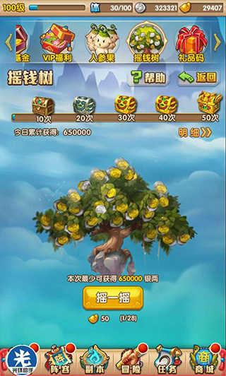 ps:摇钱树这里的产出银两是根据等级而提升的!如果急用银两时,是可以考虑再这里入手银两(不过要注意!只推荐50元宝一次的幅度!再多就不划算了)