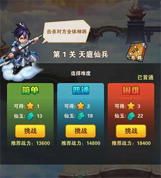 每一重天里面都有若干的小关卡,在挑战关卡之前,可以看到有3个难度供君选择,得到的奖励也不同,如果战力达到推荐战力,就尽量挑战高难度的关卡吧,可以获得更多的星星,至于为什么我会在后面告诉你。