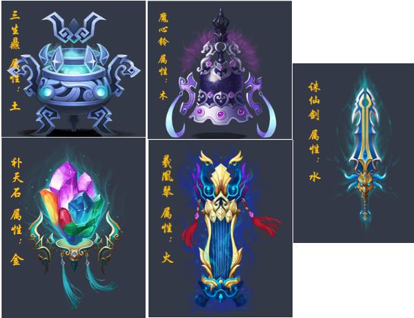 法宝共分为5种,各类法宝之间具有相互克制以及对人物属性的克制作用哦!玩法精彩多变,各位玩家可以玩出你们不一样的格调出来!