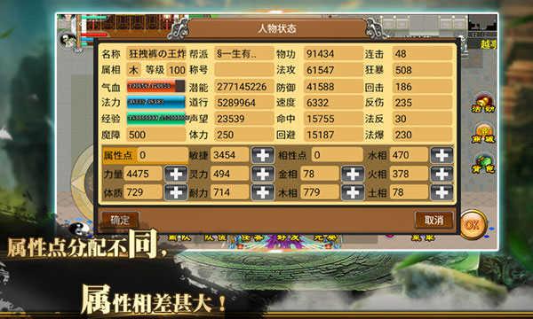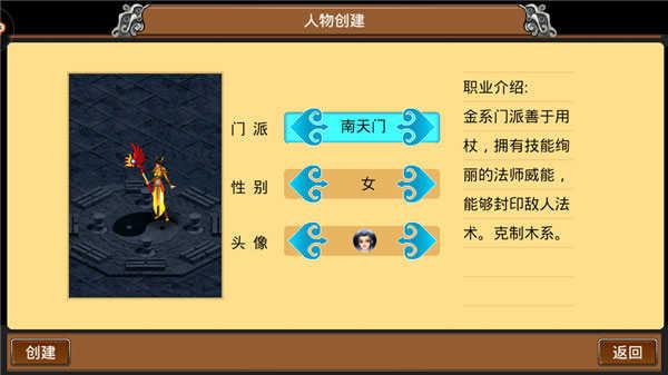 游戏分五个阵营〔也就是职业〕,分别是:金、木、水、火、土.五大仙派分别为:南天门、鬼王寨、水晶宫、火焰山、黑风洞、南天门;