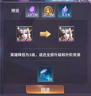 回退可以让英雄变回1级,返还所有资源,但是要花20钻,给换主力的人用的。