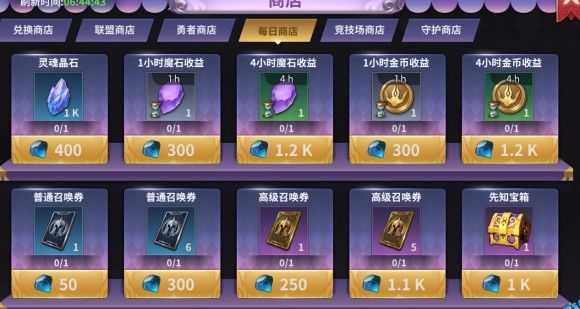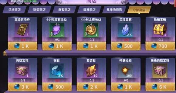 商店一共有6中分类:1兑换商店、2联盟商店、3勇者商店、4每日商店、5竞技场商店、6守护商店。