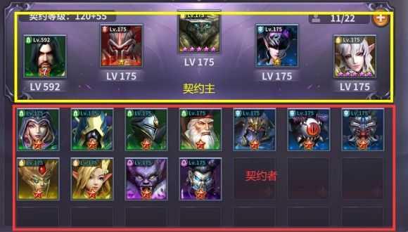 接下来说说等级契约,等级契约分为契约主和契约者,契约主不可手动放入,系统自动选择5名等级最高的英雄把他们塞进去,然后将5名英雄中等级最低一位的等级定为契约等级。但契约者需要手动放入,放入后契约者的等级会自动变成契约等级(注:无法超过契约者当前星级能达到的等级上限,例如契约等级为300级,放入5星契约者后契约者等级会变为150级。另外契约等级是包含进阶的,例如等级最低的怪为120级未进阶,那放入的契约者等级也会是120级未进阶。)