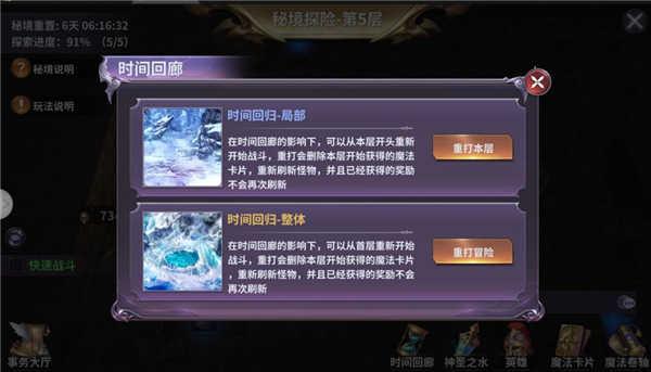 时间回廊可以对秘境探险局部或整体进行回归,回归会根据选择的回归方式,删除本层或全图获得的魔法卡片,并刷新怪物,需注意已获得的奖励不会刷新。