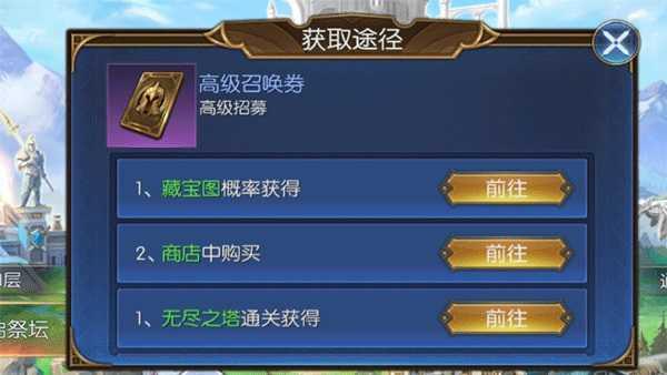 创建账号成功以后,即可获得高级招募券*5、先知宝箱*1,嗯,高级召唤券就是可在【酒馆】中召唤英雄的券。那么,如果我们想要召唤更多的英雄怎么获得召唤券呢?小编决定一秒钟之后告诉你们,哈哈哈~除了创建账号时赠送以外,高级召唤券还可以通过任务藏宝图概率获得,也可以在商店中购买,还可以通过无尽之塔通关获得~嘿嘿,除了花钱买买买,就是‘多劳多得’这个意思哦~