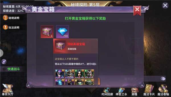 tips:秘密探险,通关宝箱前会有魔物守护,第二与第四层会存在两个黄金宝箱,分别代表普通与困难难度,开启后会前往相应难度的下一层,当以困难等级难度通关时,还可以获得一个sss英雄宝箱。