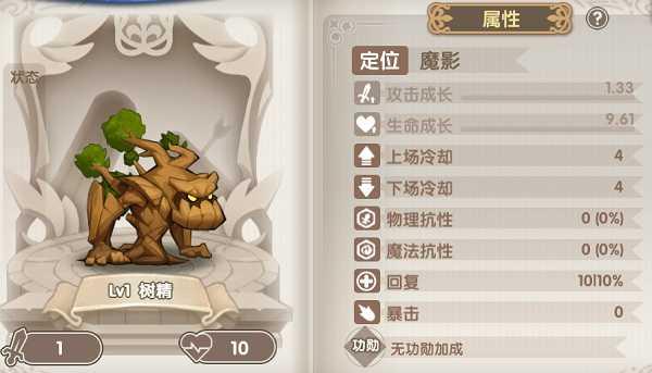 树精是精灵的坦克角色,拥有较高的生命成长,但是攻击成长比较中庸。每回合树精可以对我方血量最低的英雄造成一次树精最大生命值伤害,所以战斗前期在树精还没有成长起来的时候,骚扰能力较弱,后期需要注意输出位的血量是否处于最低状态,避免输出位承受过多的伤害。