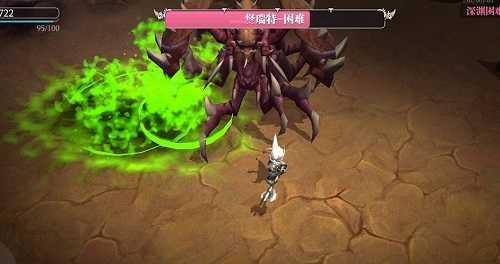 技能二:督瑞特身体发出黄绿色的光,背部分泌出绿色的毒液,锁定玩家并喷溅毒液,造成伤害和减速效果。