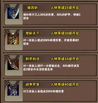 25级:旋风斩 :增加我方三人50%护甲,30%的伤害维持三个回合。