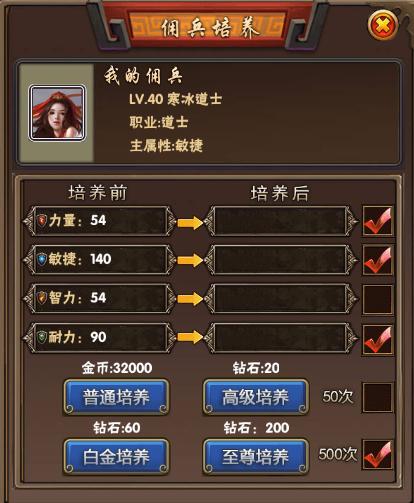 道士佣兵培养推荐:力量、敏捷、耐力(或者单敏捷)