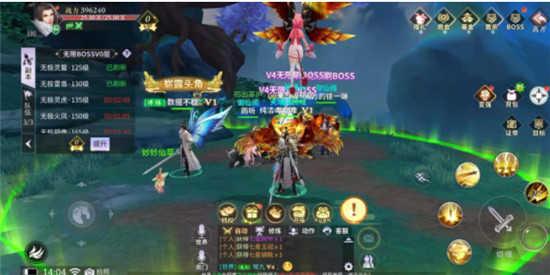 3、无限BOSS玩法,等级达到要求之后开启无限BOSS,每天进入次数没有上限,玩家可以组队挑战各种等级不同的BOSS,根据每个队伍伤害的高低给奖励,最多可以有15个队伍共享,BOSS从125级开始分为不同难度,在被玩家击杀之后有几分钟的复活时间,可以多次挑战,击杀后掉落大量的经验丹,前期可以帮助玩家快速升级。
