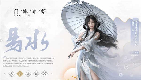 易水是水属性门派,以伞为武器。门派特点是远程、治疗、免控。易水操作难度不高,技能好上手,在战斗中只要时刻能在队友后方保持灵活移动,在保证队友奶量的同时也能打出一定的输出。