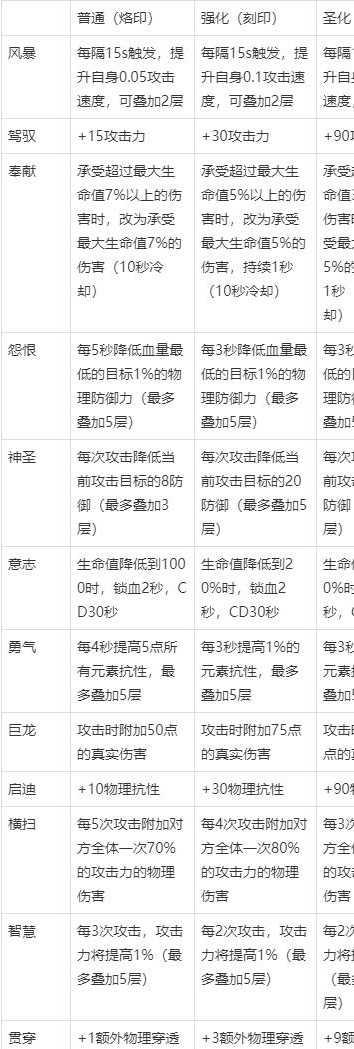 符文级别:符文有3种级别,普通(烙印)、强化(刻印)、圣化(符文)。每3个低级符文可以通过铁匠铺的锻造功能合成高一级别的符文,合成成功率100%。各个级别符文属性加成效果如下表:
