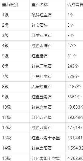 5、宝石级别:宝石有15个级别,每3个低级别宝石可以通过铁匠铺的锻造功能合成高一级别的宝石,合成成功率100%。以红宝石为例,15个级别宝石的名称以及要想合成一个对应级别的宝石,换算成1级宝石,共需要多少块(哇咔咔,3的14次方是多大?)。