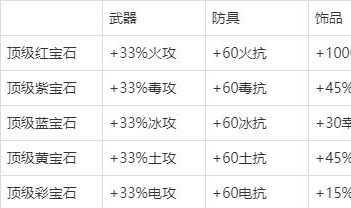 3、宝石分类:宝石分为红、紫、蓝、黄、彩五种,可以镶嵌到有孔的装备上,根据镶嵌目标装备的不同,会有不同的属性效果。比如红宝石,镶嵌到武器上增加火攻,镶嵌到防具上增加火抗,镶嵌到饰品上增加生命值。