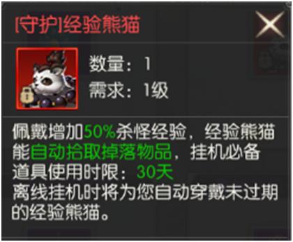 如果你觉得刷怪经验获取比较慢,怎么办?莫慌,小编锦囊自有妙计。首先要介绍的就是经验熊猫,这萌萌的熊猫在你刷怪升级的时候能给你提供50%的额外经验奖励呢!