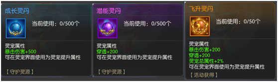 可使用成长灵丹、潜能灵丹和飞升灵丹给灵宠提升属性,三者的使用上限分别为500、500和50。