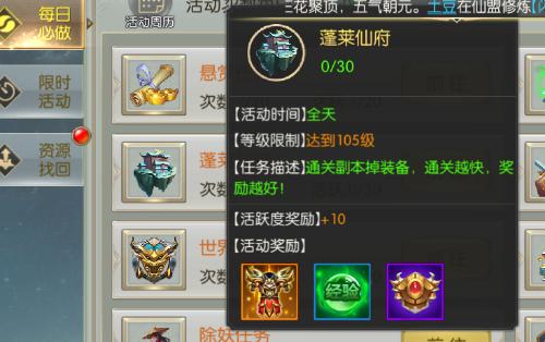 如果你既想获得经验,又想获得装备,那你可以选择蓬莱仙府副本,每天能进行三次,超过三次能获得荣誉。
