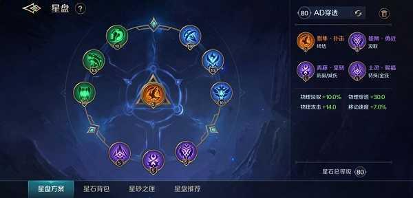 星盘:星石的载体,上面有10个凹槽可以镶嵌不同的星石,分别是三个绿色凹槽、三个蓝色凹槽、三个紫色凹槽、一个橙色凹槽。绿、蓝、紫、橙星石分为攻击、防御、功能三种类型,每种颜色类型的星石都只能装配其中一个。