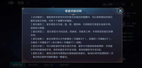 上图是星盘功能的主界面,可在此界面点击星石进行替换和升级操作,右方显示蓝色和绿色星石的属性总和,而紫色和蓝色星石需要点击星石查看属性。